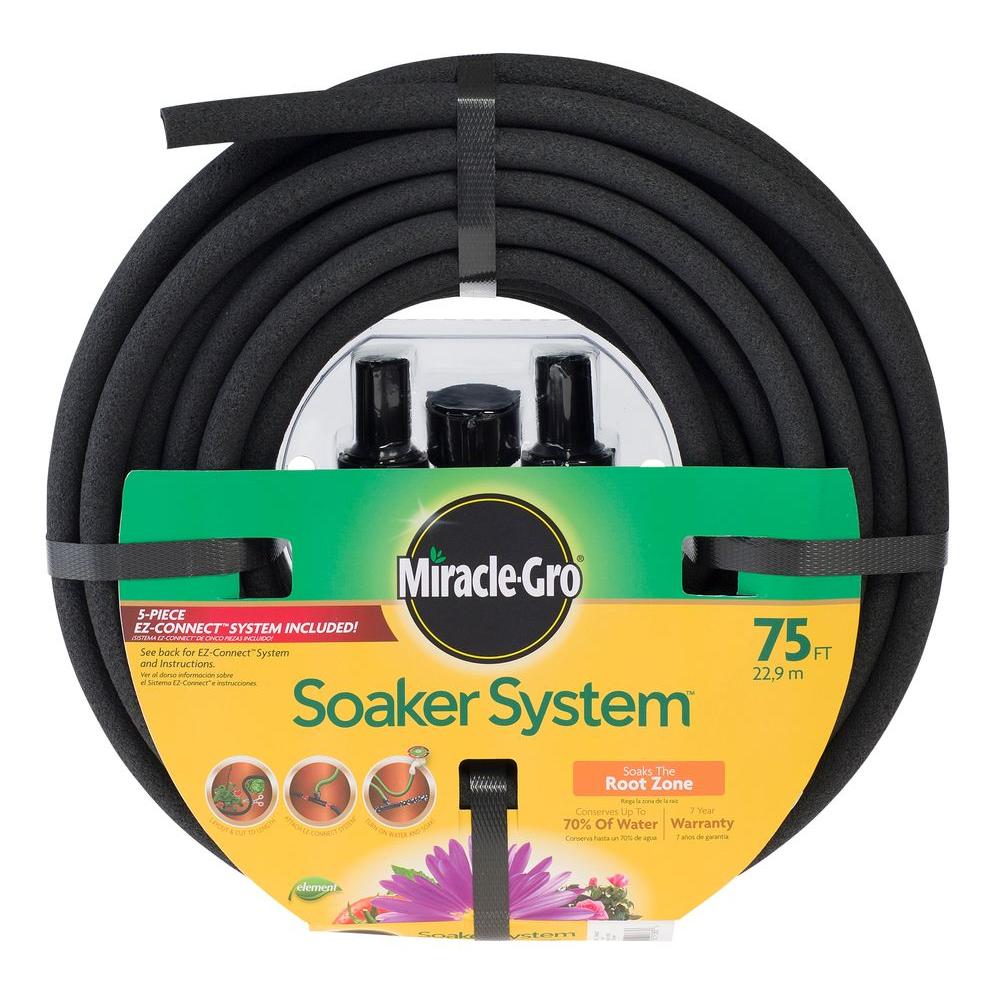 Miracle-Gro Soaker System is completely customizable to meet all your flower bed, lawn and garden needs. The system is quick and easy to set up; simply cut the hose push on the EZ-Connect System connectors and you’ll be ready to start watering. When filled with water the hose weeps through its pores, soaking the earth and bringing moisture to the roots where it’s needed most. The 75 ft. length is perfect for a larger yard or maintaining delicate landscaped areas and is packaged with five connectors
